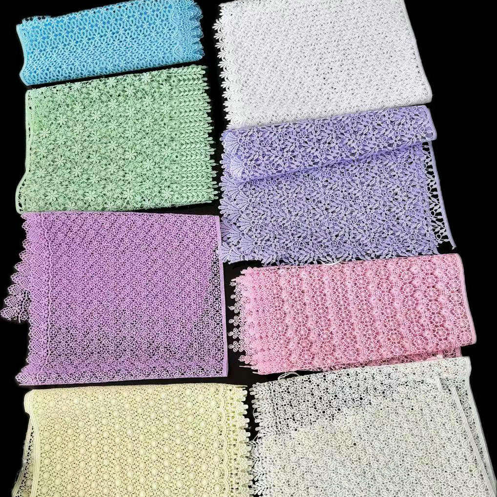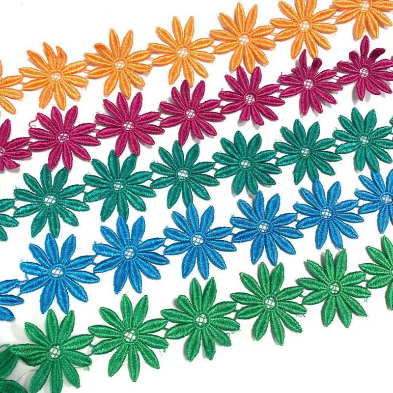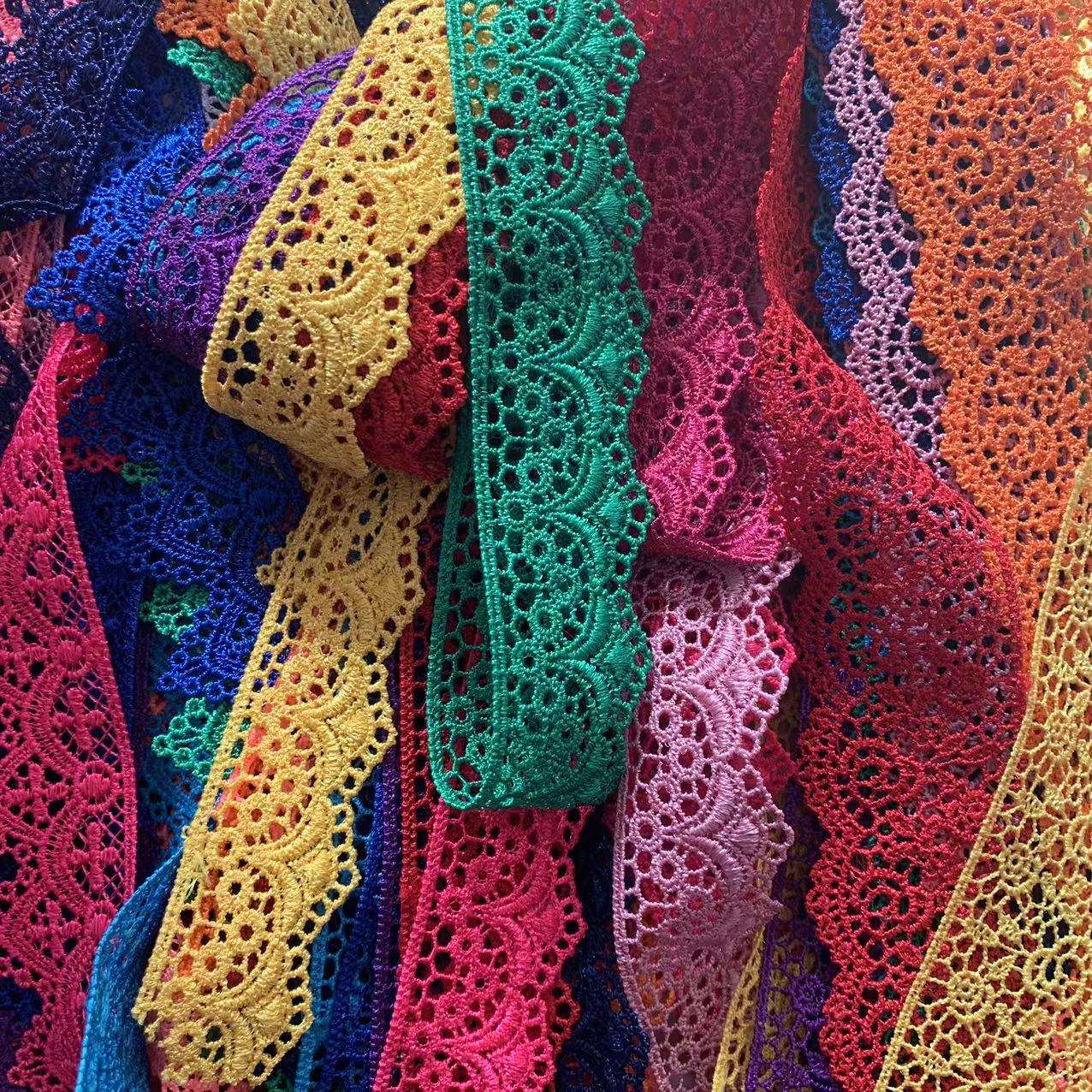 Прилагодена полиестерска чипка тесна вез на чипка, мулти-боја изработена од висококвалитетен полиестерски материјал, со фино занаетчиство за вез, има богати бои и прилагодлива ширина. Погоден е за декорација на женска облека, детска облека и предмети за домаќинството