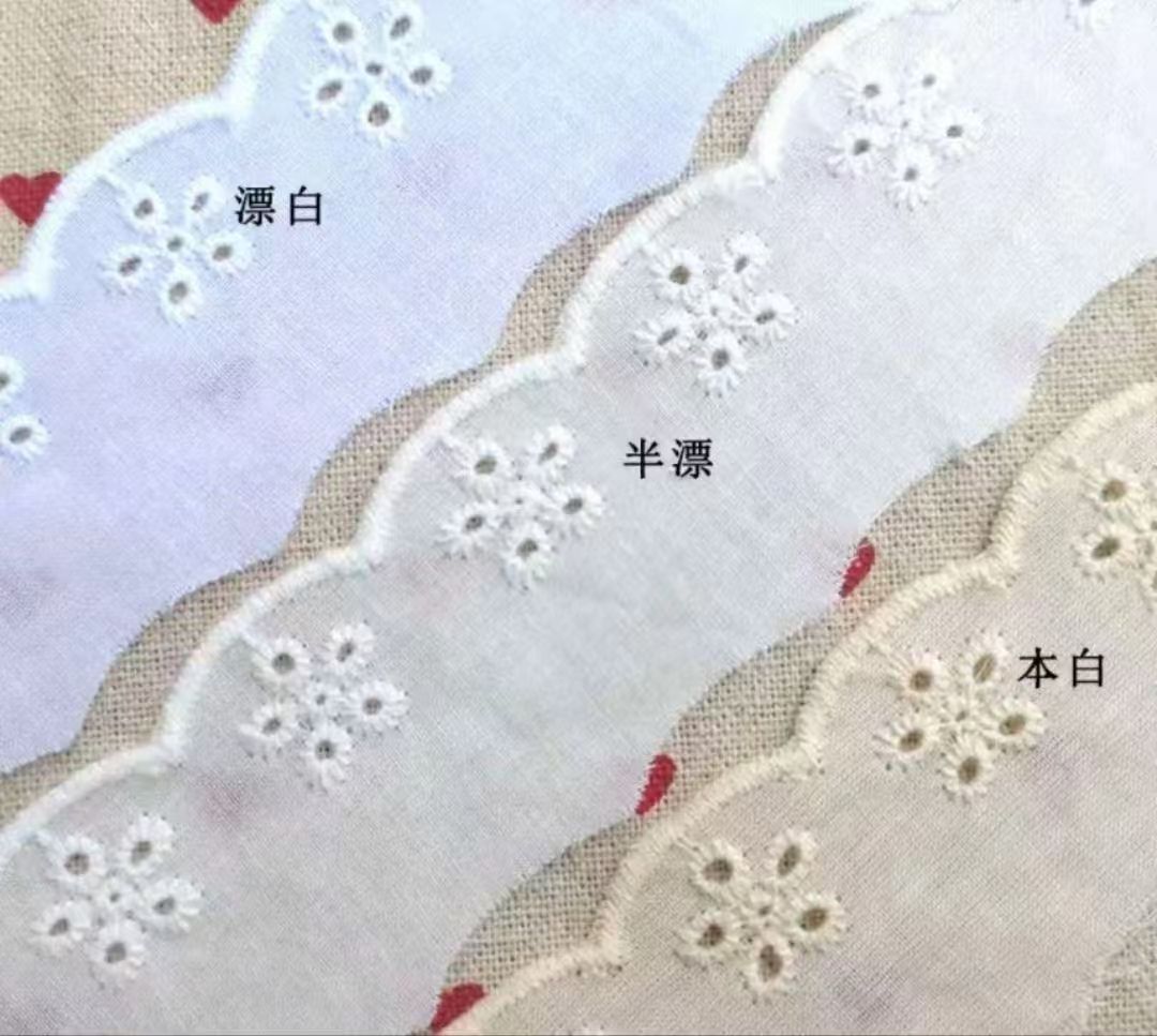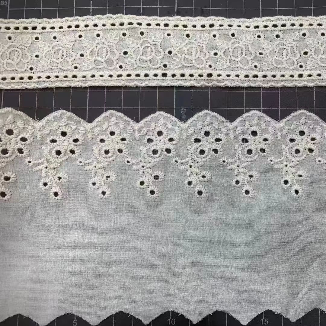 T/C памучна чипка за чипка Везење памучна чипка, цвет цвет T/C очите на чипка е изработено од мешавина од полиестер-котон (T/C) материјал, кој е мек и дише, комбинирајќи ја издржливоста на полиестер со удобноста на памукот. Дизајнот вклучува најразлични стилови, како што се везена чипка, цветен исечок и чипка од мрежа, погодна за исклучително работење и крпеница во облека и украсување на домови. Тој нуди различни опции за ширина и боја, поддржува прилагодување и ги зема предвид и естетиката и практичноста.